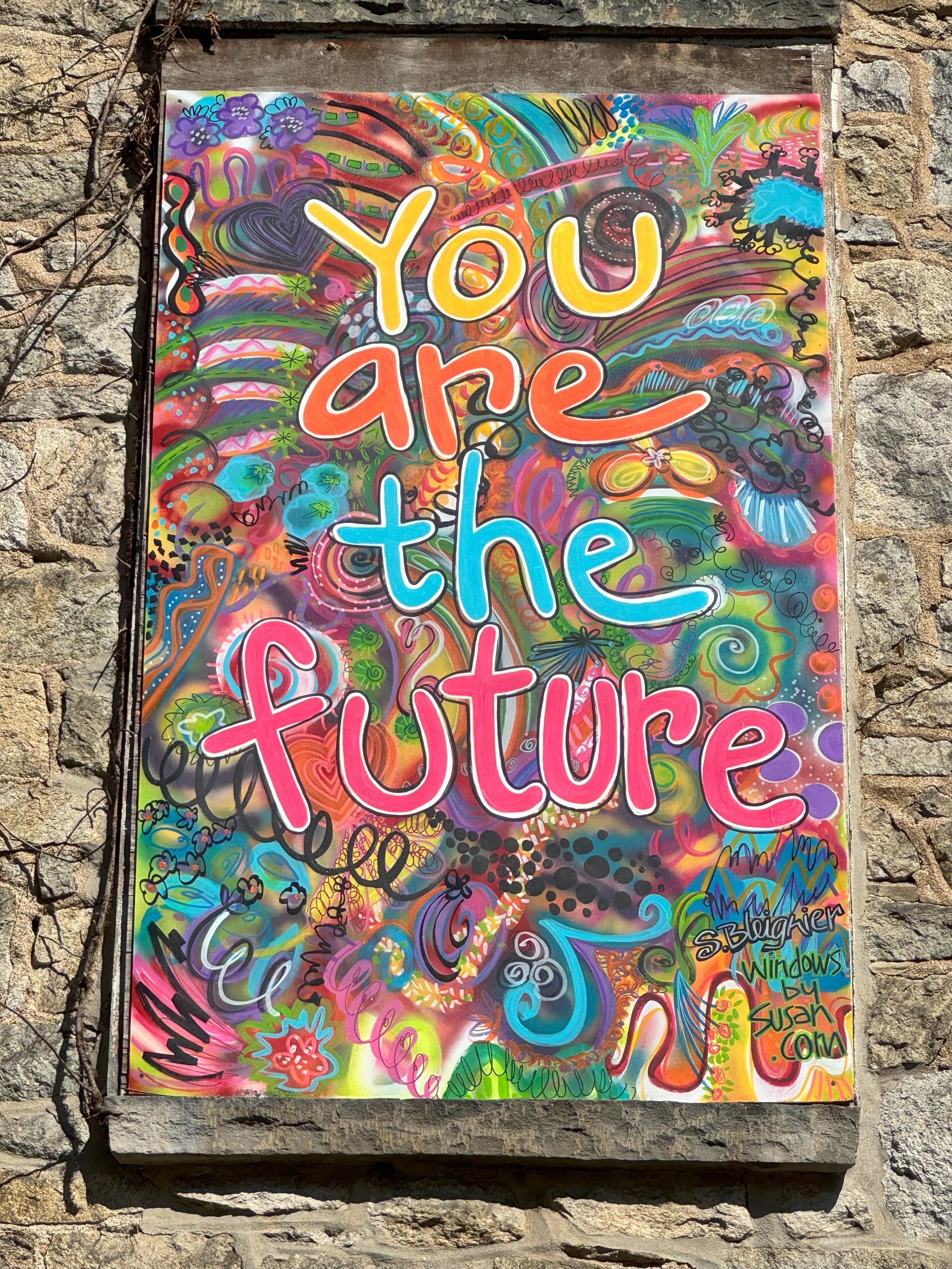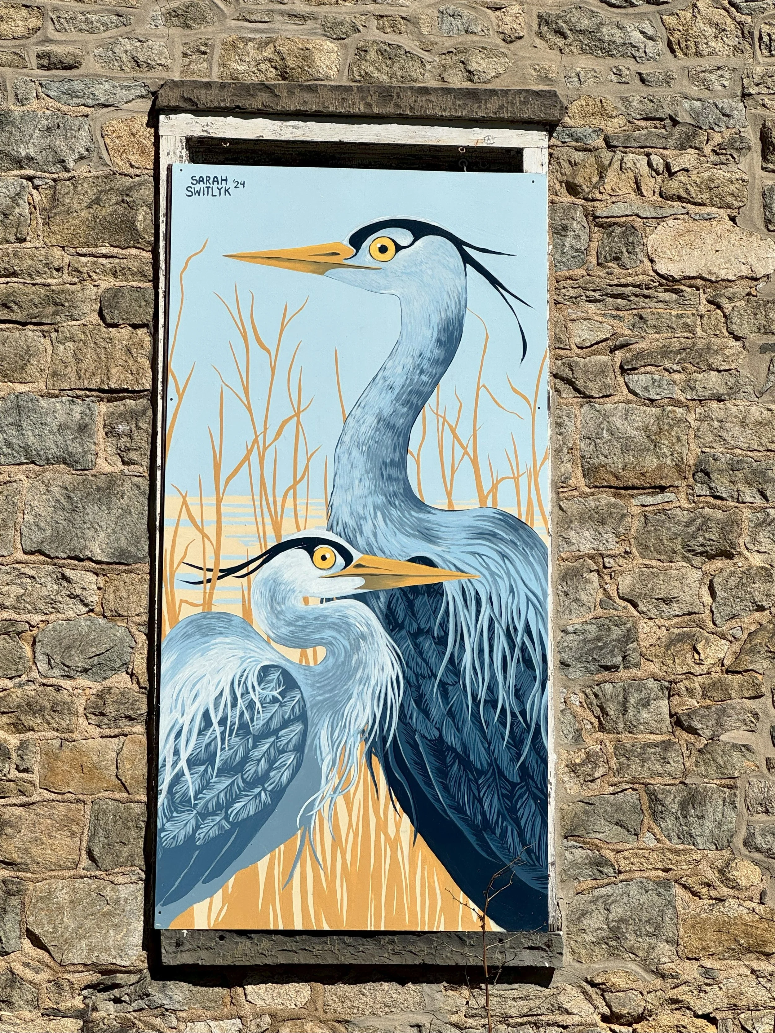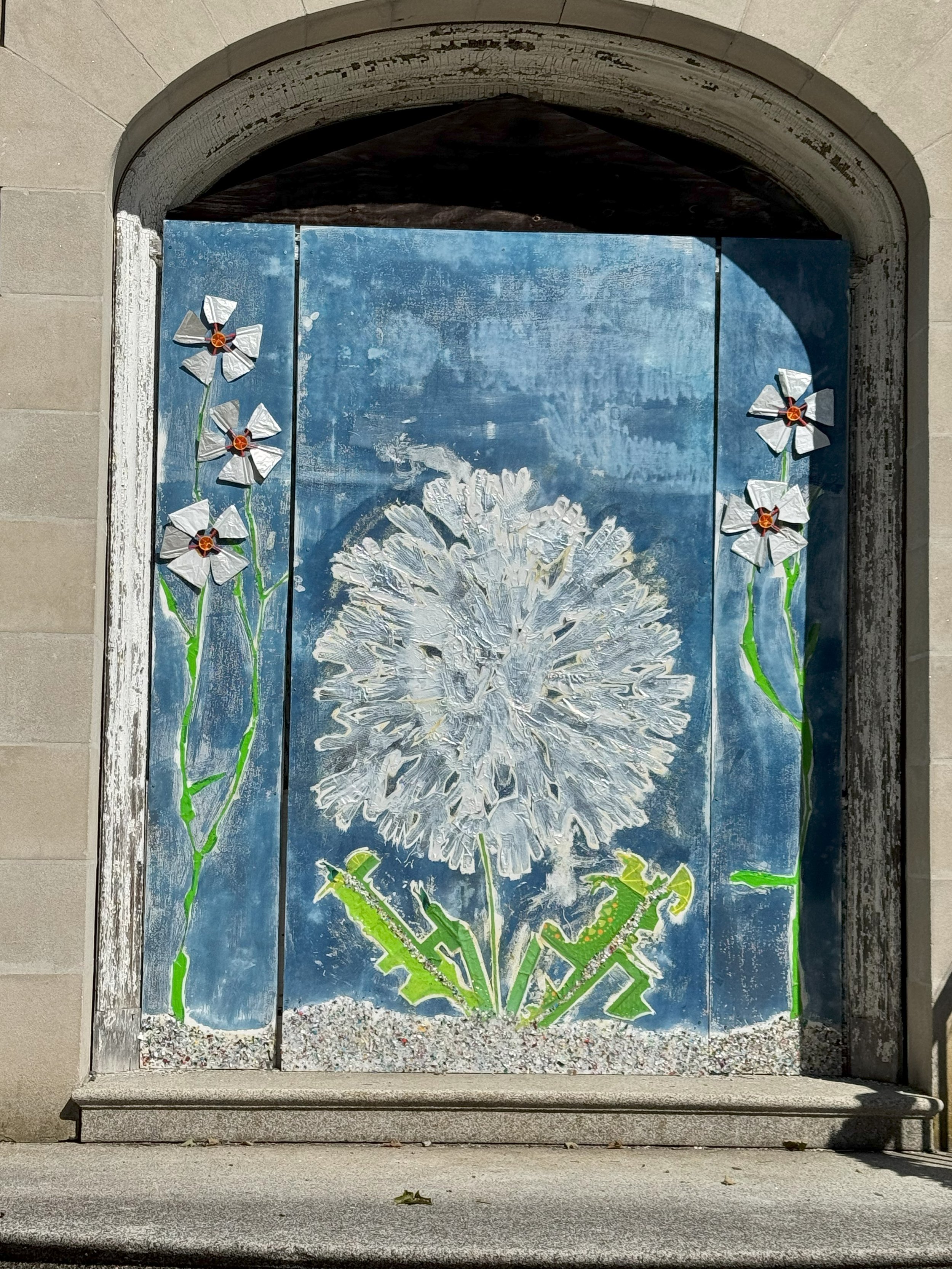 Artist Amanda Henriksen playful plywood dinosaur standees are scattered throughout the TISCO grounds. They are painted in chalk paint, so you can decorate them. Keep an eye out- you never know where one might be hiding!