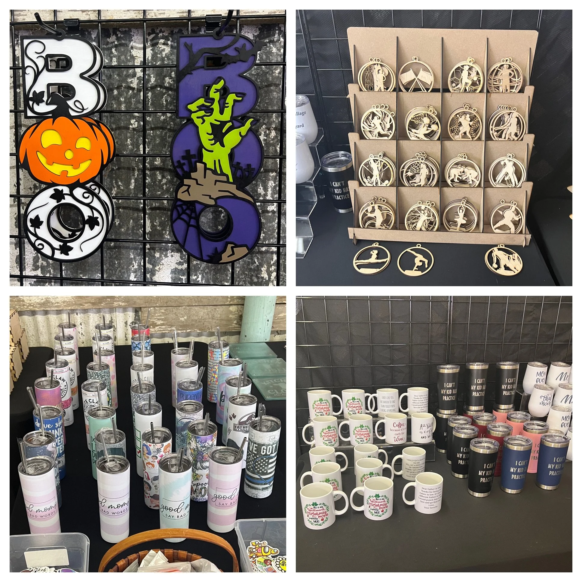 Sublimated tumblers, coasters, wind spinners, magnets, keychains, ornaments.